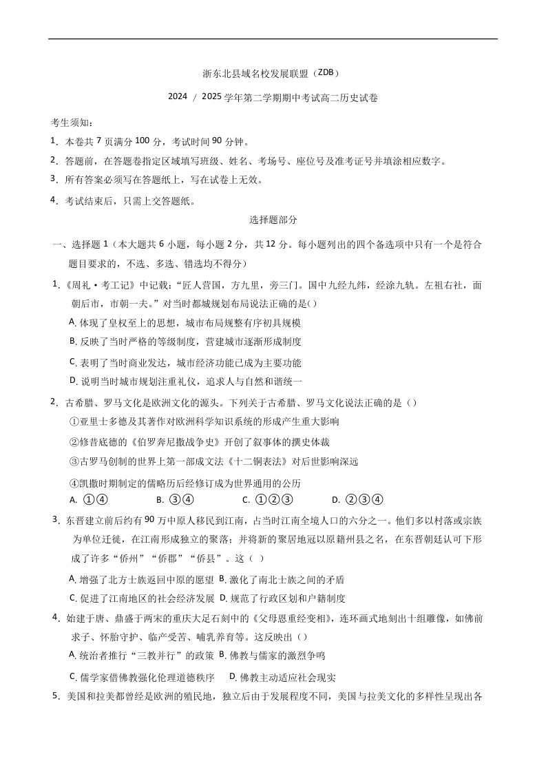 浙江省ZDB名校发展联盟2024-2025学年下学期4月高二期中考试历史+答案