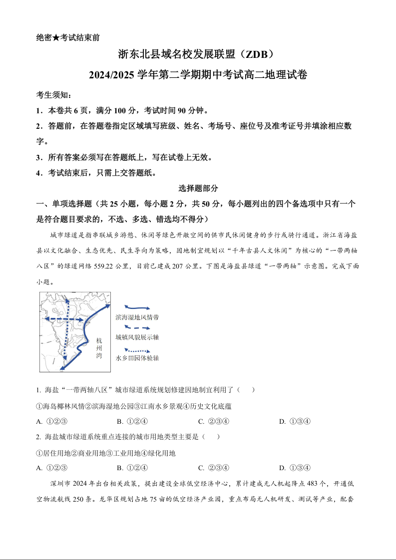 浙江省ZDB名校发展联盟2024-2025学年下学期4月高二期中考试地理+答案