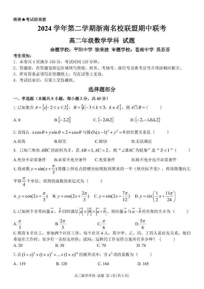 浙江省浙南名校联盟2024-2025学年下学期4月高二期中考试数学+答案