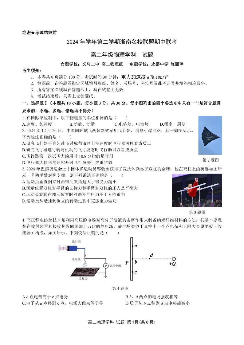 浙江省浙南名校联盟2024-2025学年下学期4月高二期中考试物理+答案