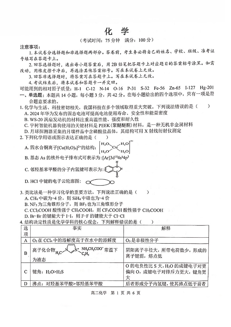 广西壮族自治区“贵百河”联考2024-2025学年下学期5月高二月考化学+答案