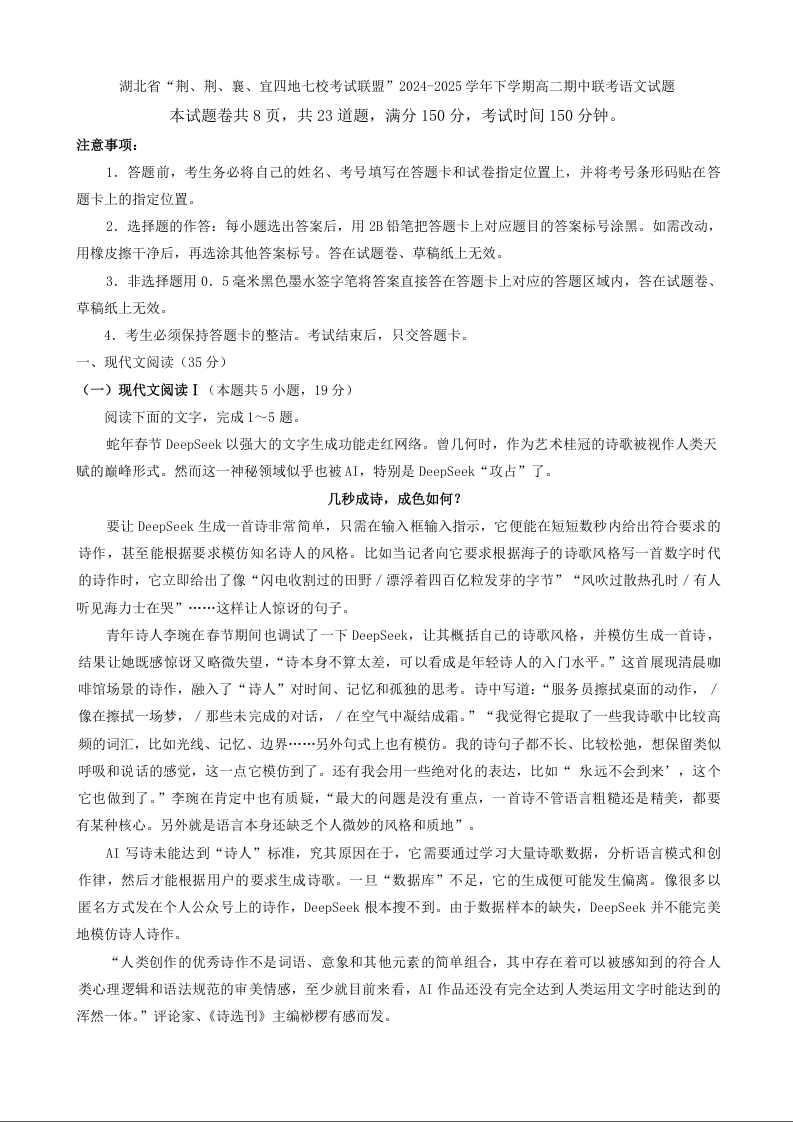 湖北省“荆、荆、襄、宜四地七校”2024-2025学年高二下学期期中联考语文+答案