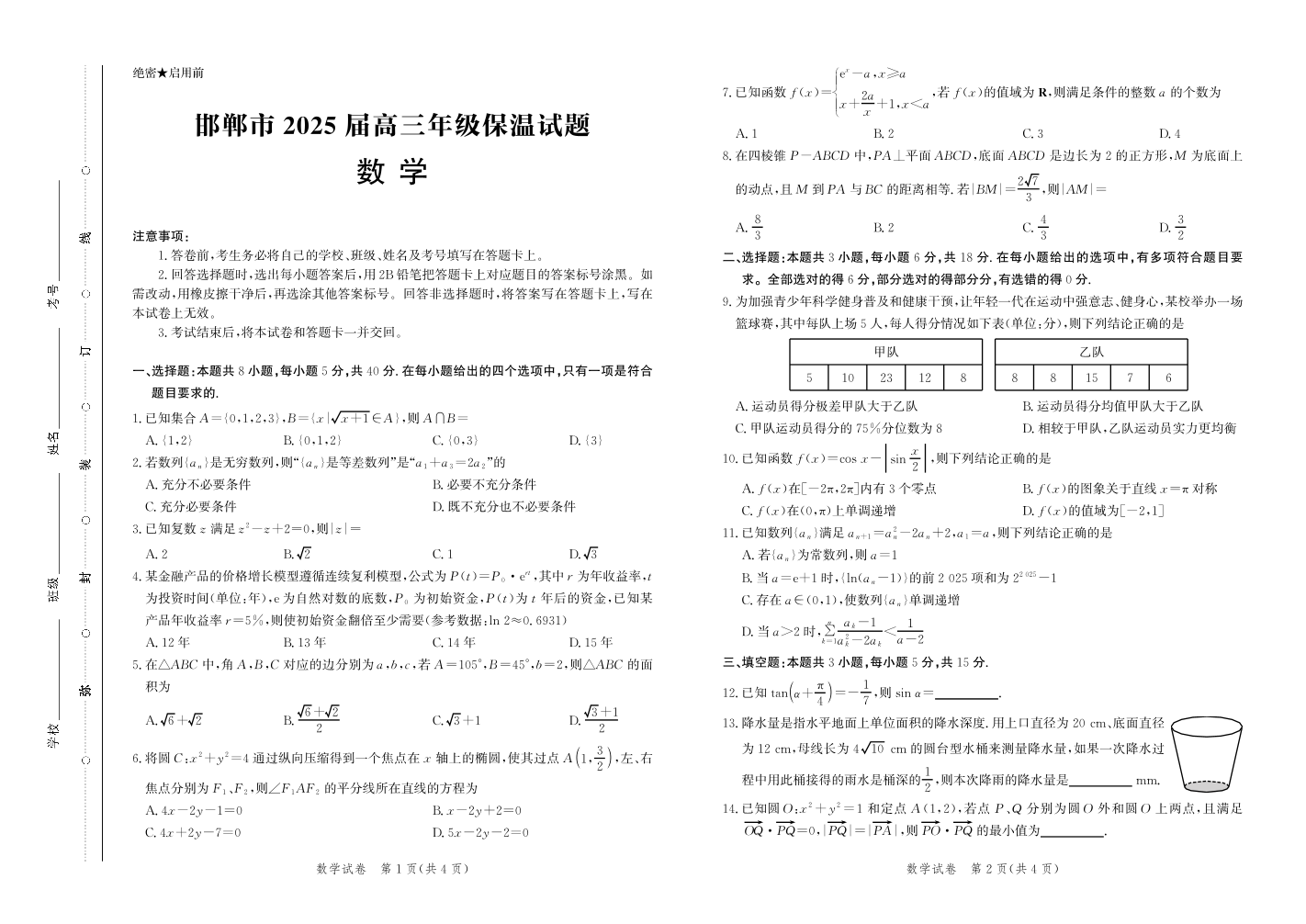 河北省邯郸市2025届下学期5月高三保温考试数学
