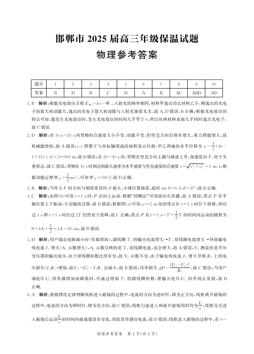河北省邯郸市2025届下学期5月高三保温考试物理答案