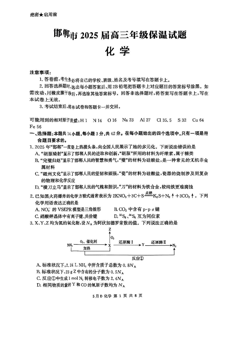 河北省邯郸市2025届下学期5月高三保温考试化学