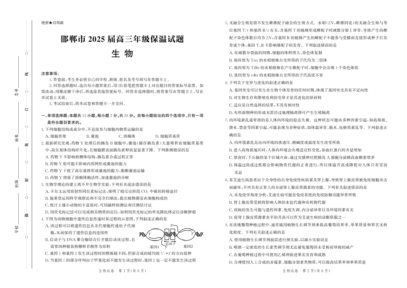 河北省邯郸市2025届下学期5月高三保温考试生物