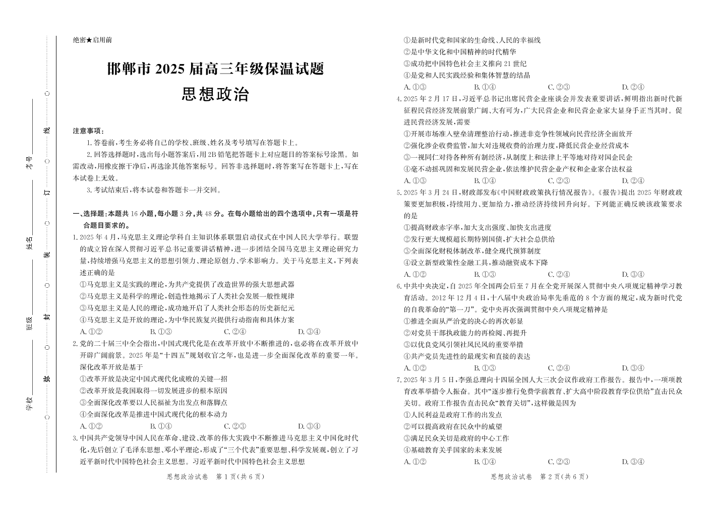 河北省邯郸市2025届下学期5月高三保温考试政治