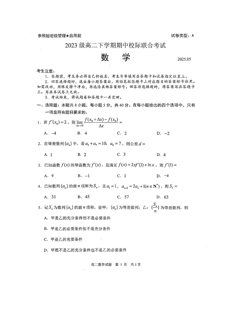山东省日照市2024-2025学年下学期高二期中校际联合考试数学+答案