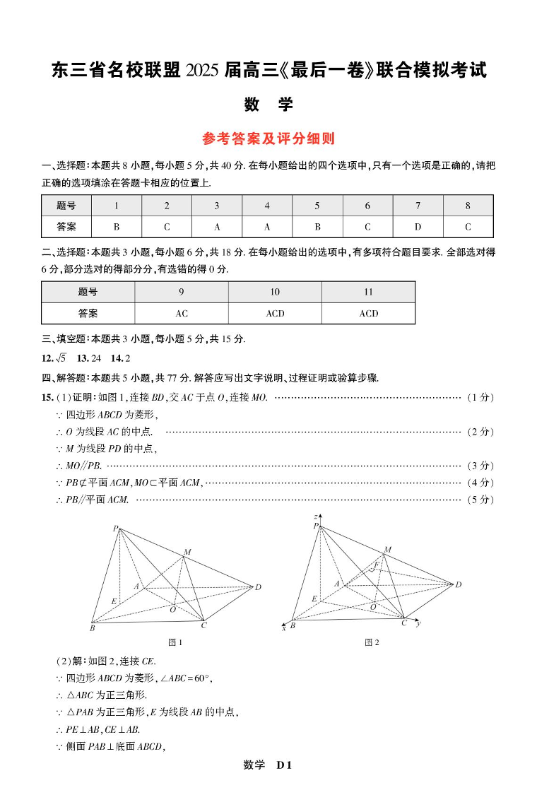 东三省名校联盟2025届高三下学期最后一卷联合模拟考试数学答案