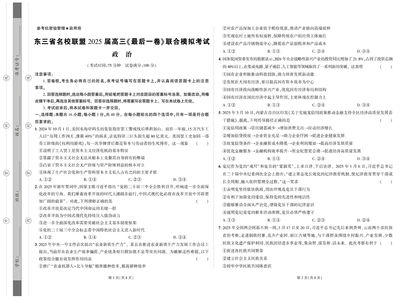 东三省名校联盟2025届高三下学期最后一卷联合模拟考试政治