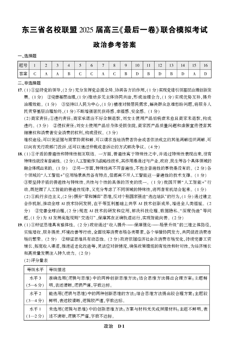 东三省名校联盟2025届高三下学期最后一卷联合模拟考试政治答案