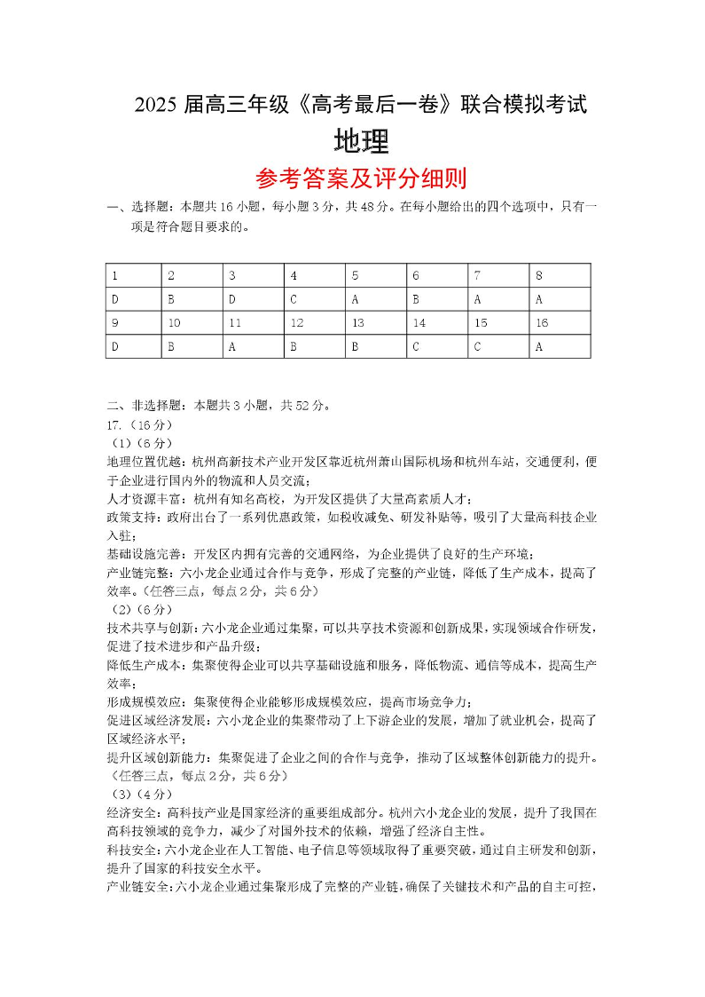 东三省名校联盟2025届高三下学期最后一卷联合模拟考试地理答案