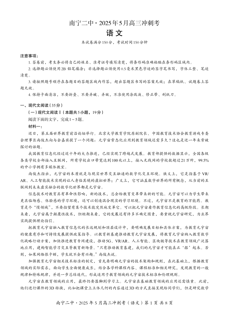 广西壮族自治区南宁二中2025年5月高三冲刺考试语文