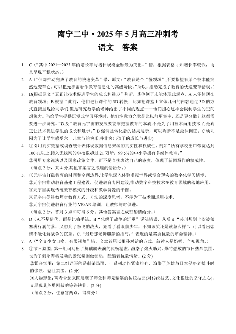 广西壮族自治区南宁二中2025年5月高三冲刺考试语文答案