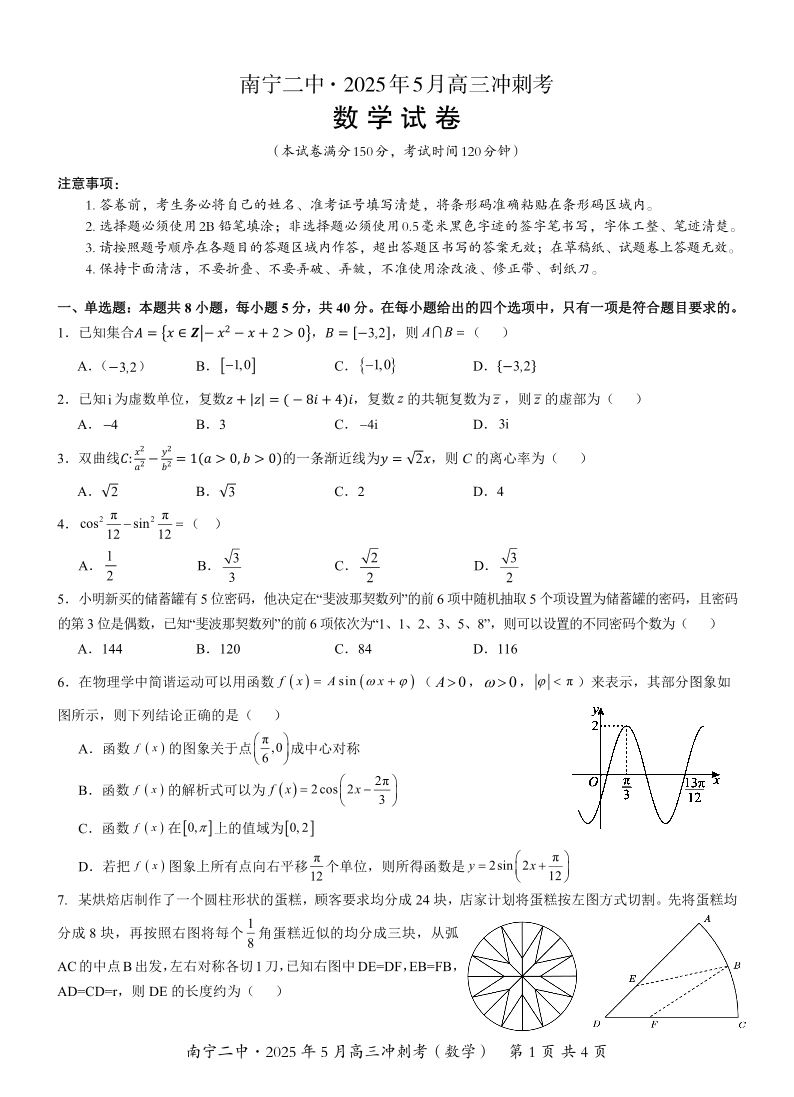 广西壮族自治区南宁二中2025年5月高三冲刺考试数学