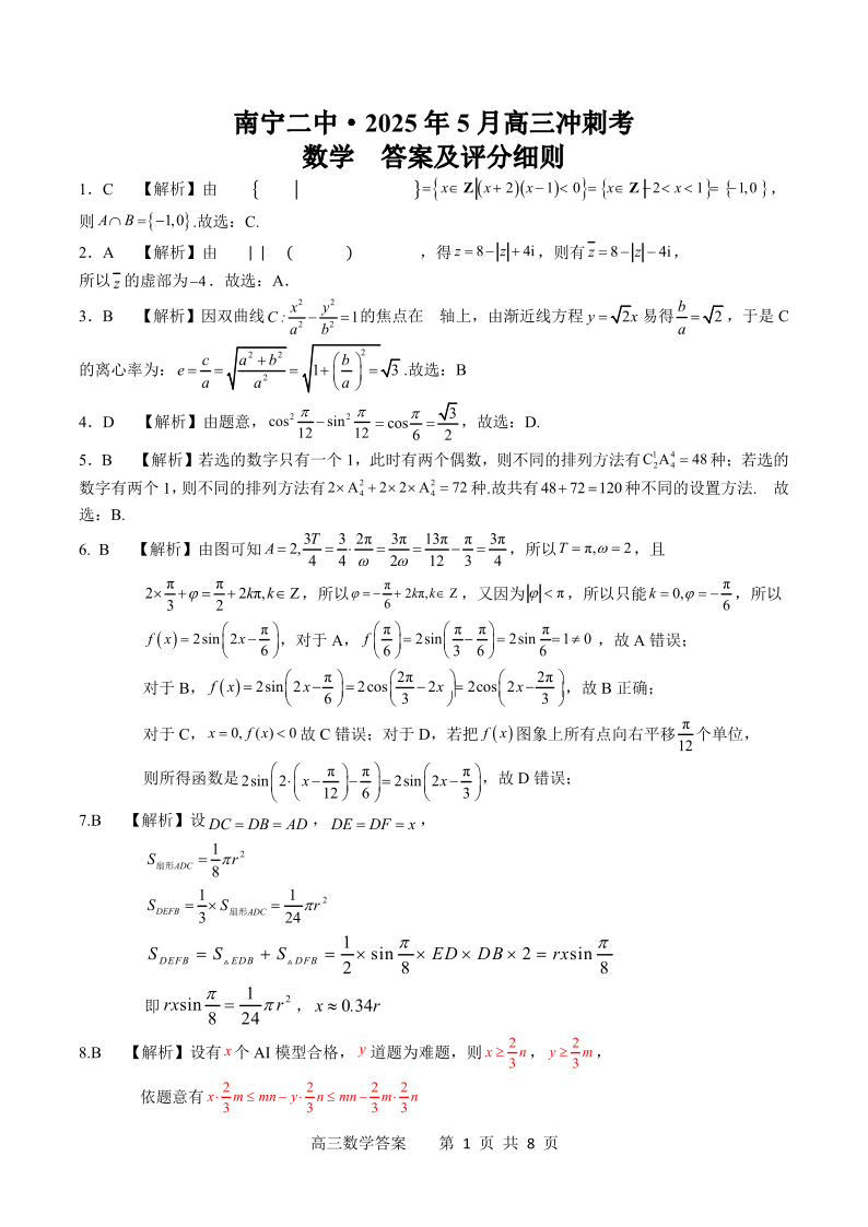 广西壮族自治区南宁二中2025年5月高三冲刺考试数学评分标准