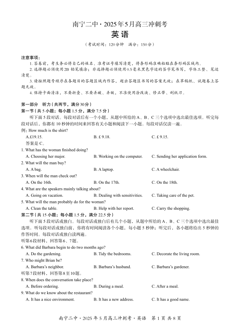 广西壮族自治区南宁二中2025年5月高三冲刺考试英语