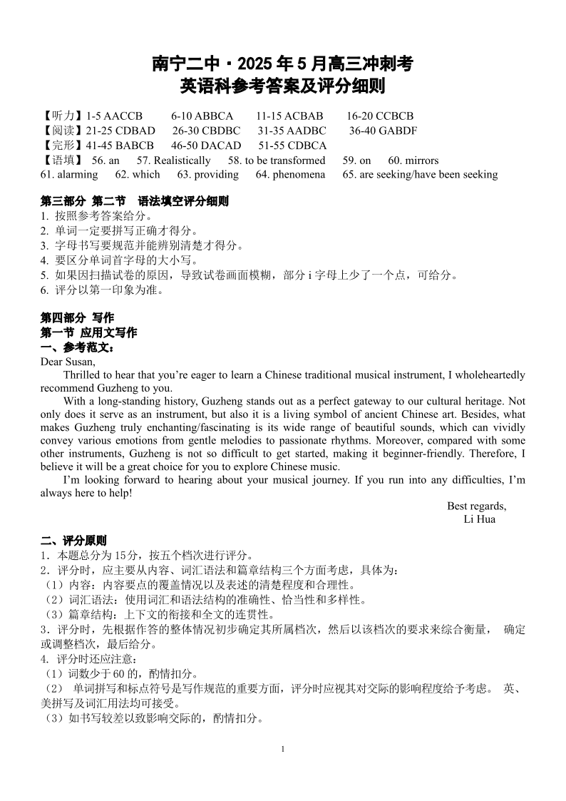 广西壮族自治区南宁二中2025年5月高三冲刺考试英语答案
