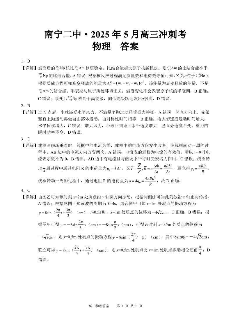 广西壮族自治区南宁二中2025年5月高三冲刺考试物理答案
