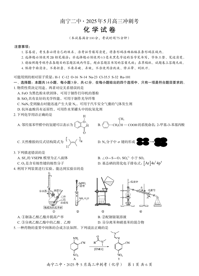 广西壮族自治区南宁二中2025年5月高三冲刺考试化学