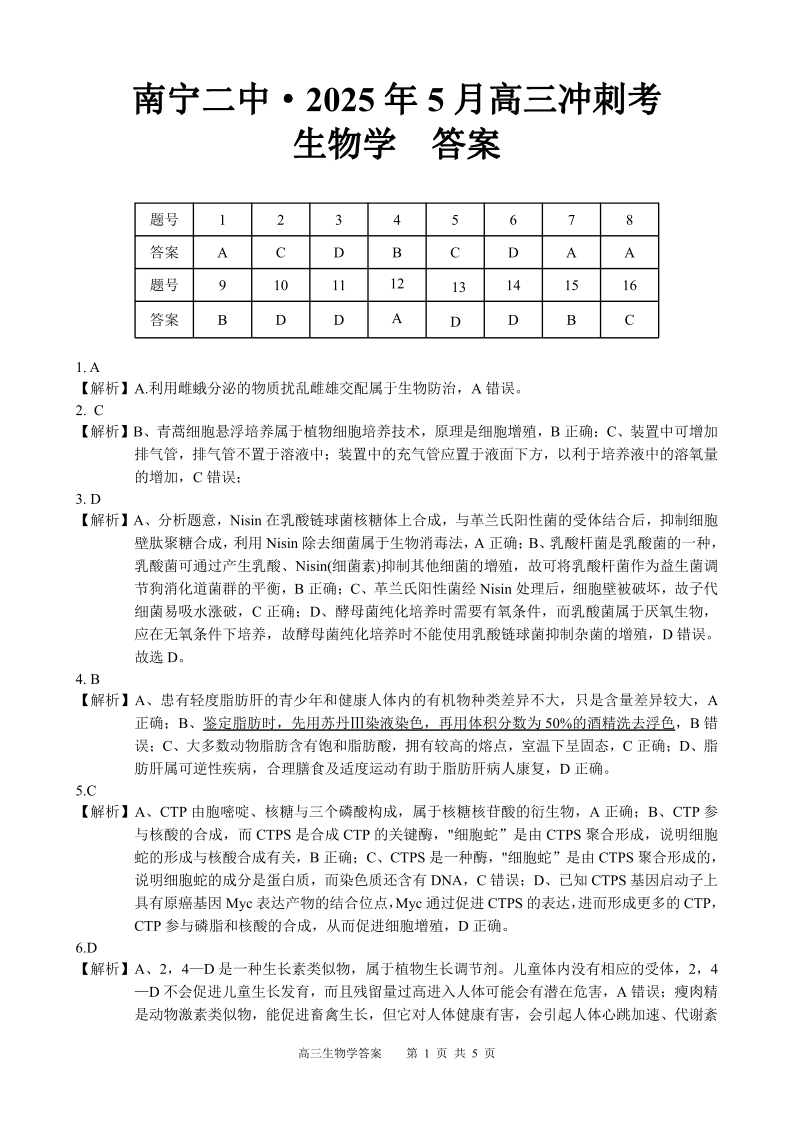 广西壮族自治区南宁二中2025年5月高三冲刺考试生物答案