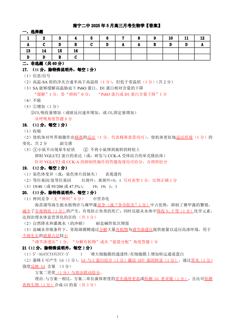 广西壮族自治区南宁二中2025年5月高三冲刺考试生物评分细则