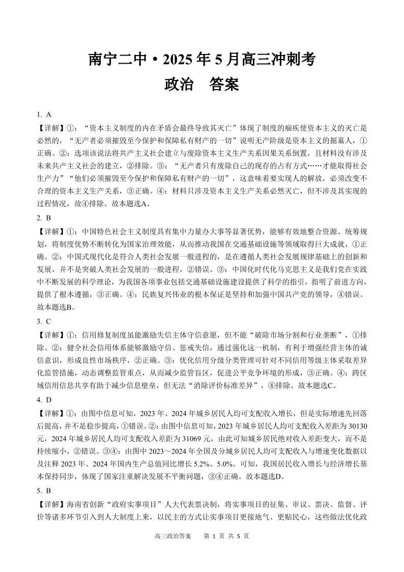 广西壮族自治区南宁二中2025年5月高三冲刺考试政治答案