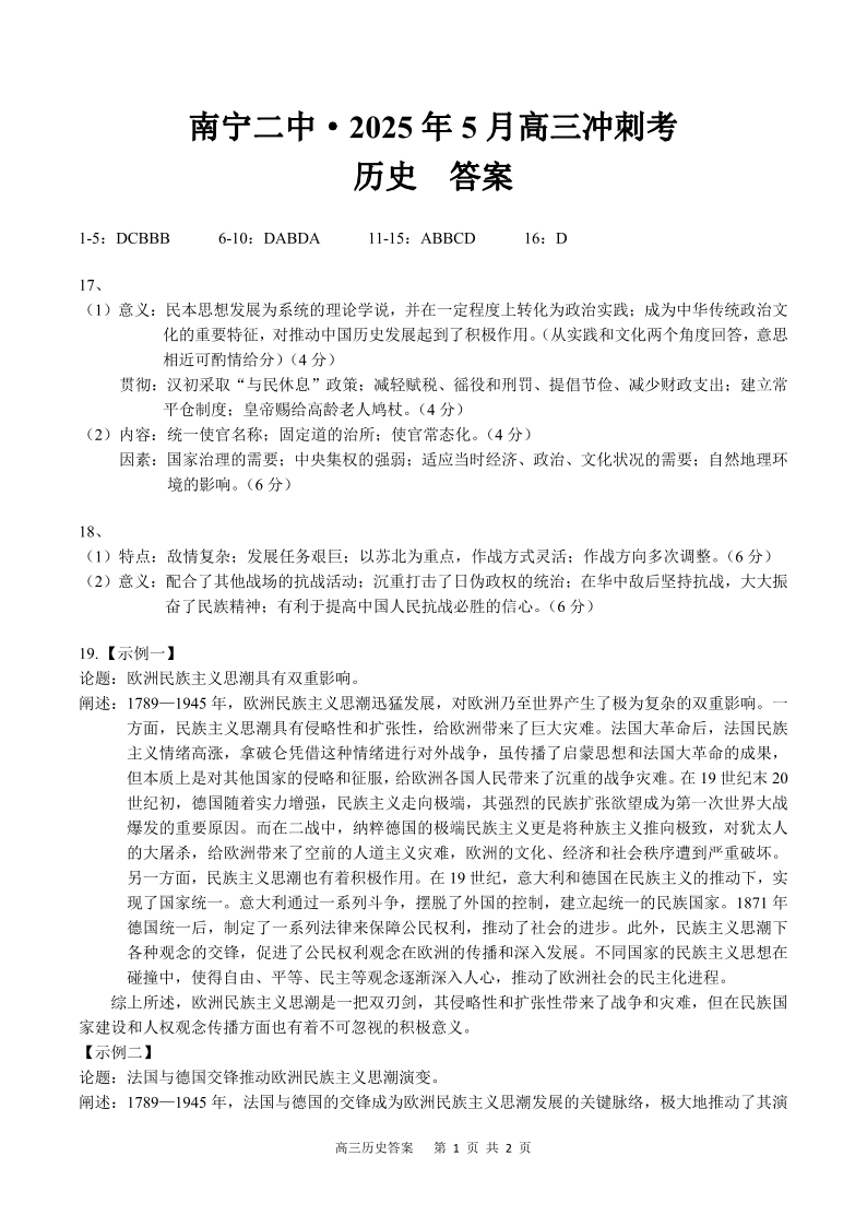广西壮族自治区南宁二中2025年5月高三冲刺考试历史答案