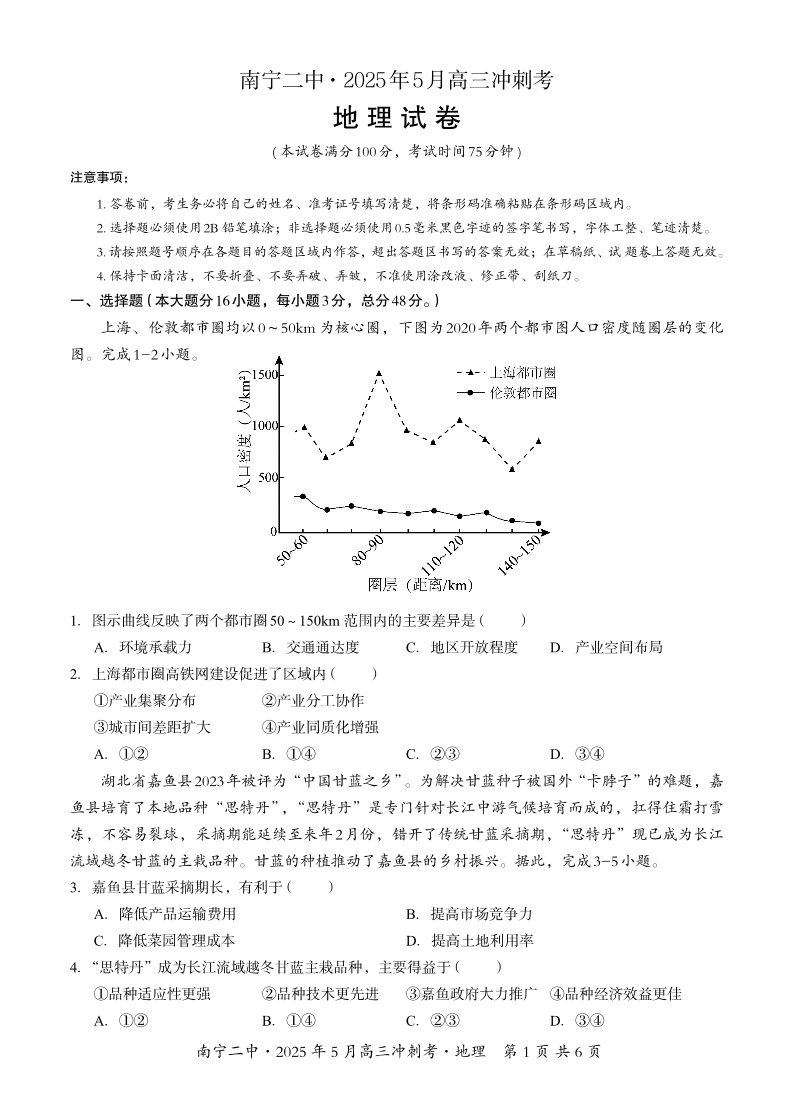 广西壮族自治区南宁二中2025年5月高三冲刺考试地理