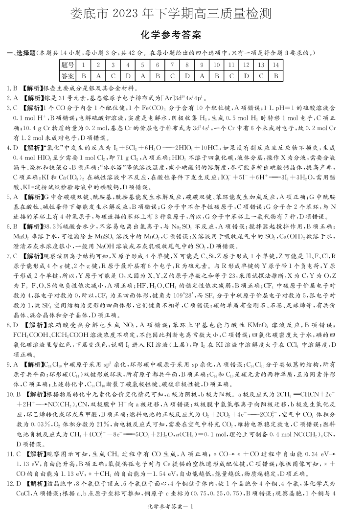 湖南省娄底市2024届高三上学期期末考试化学答案