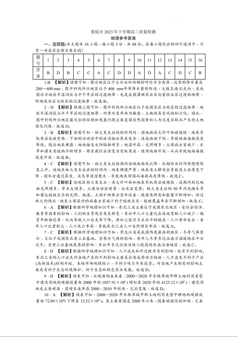 湖南省娄底市2024届高三上学期期末考试地理答案