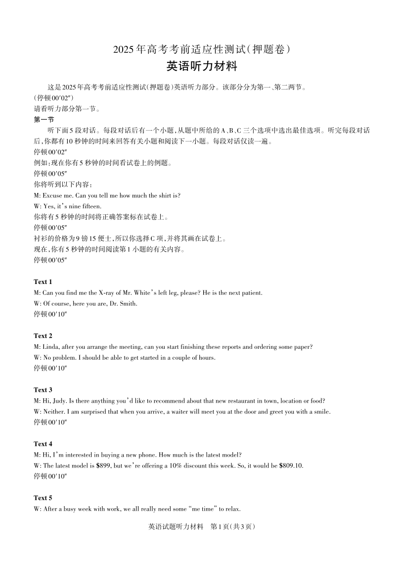 山西省区域高中2025届高三考前三模测试英语听力材料