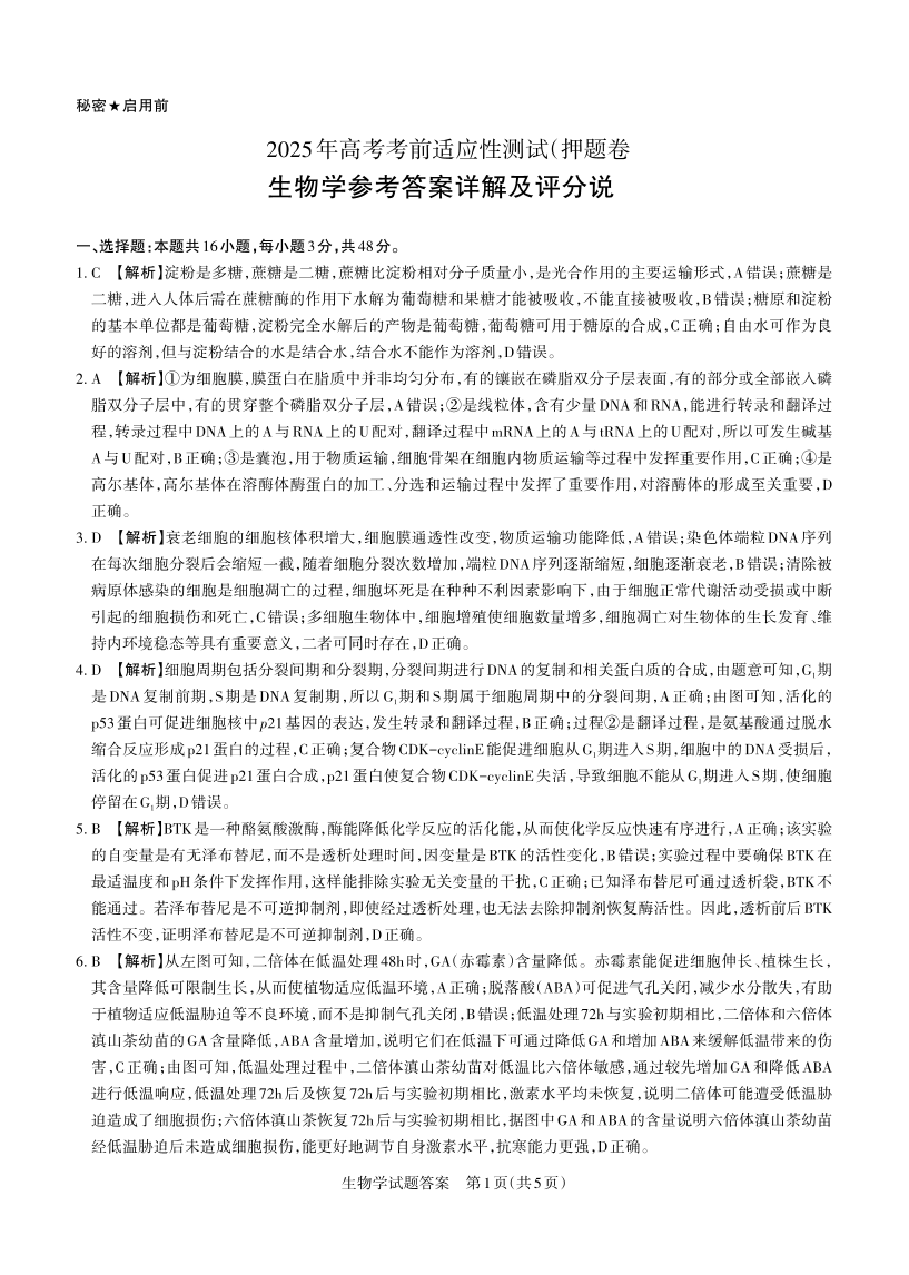 山西省区域高中2025届高三考前三模测试生物答案与详解