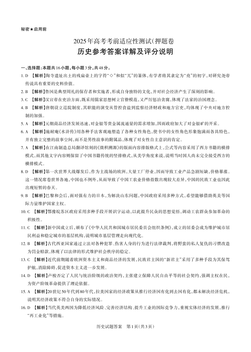 山西省区域高中2025届高三考前三模测试历史答案与详解
