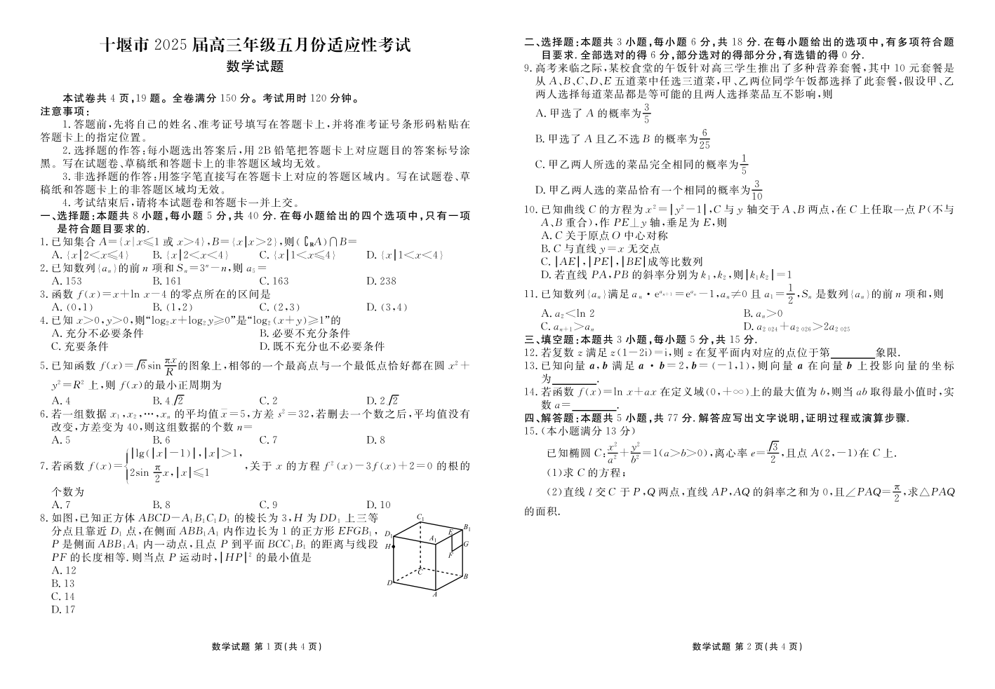 湖北省十堰市2025届下学期五月高三适应性考试数学