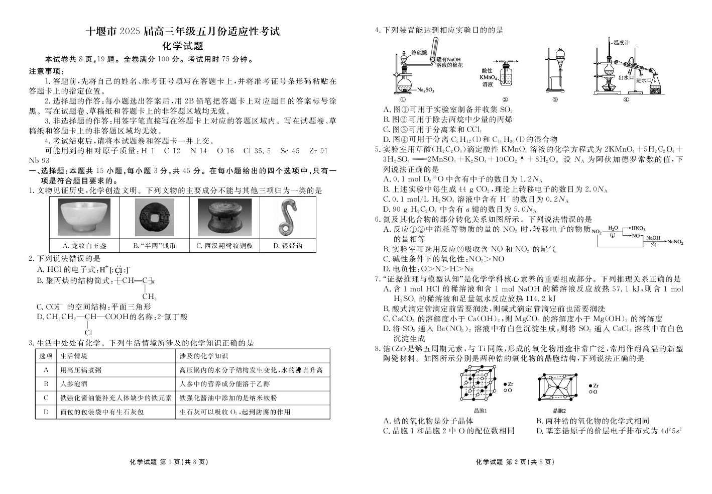 湖北省十堰市2025届下学期五月高三适应性考试化学+答案