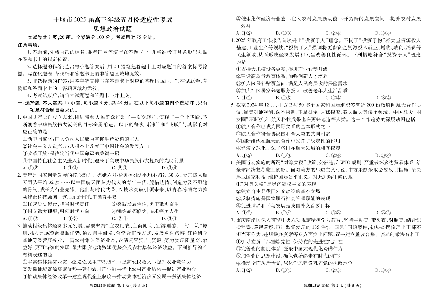 湖北省十堰市2025届下学期五月高三适应性考试政治
