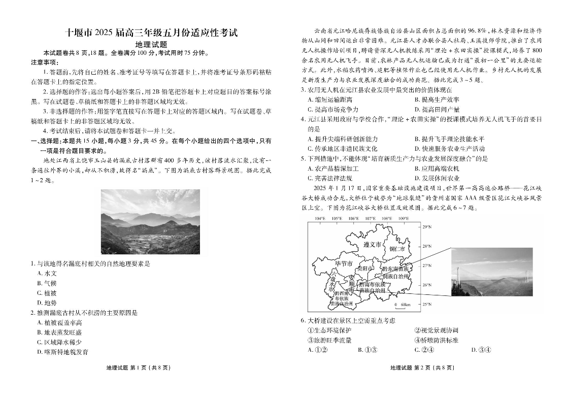 湖北省十堰市2025届下学期五月高三适应性考试地理+答案