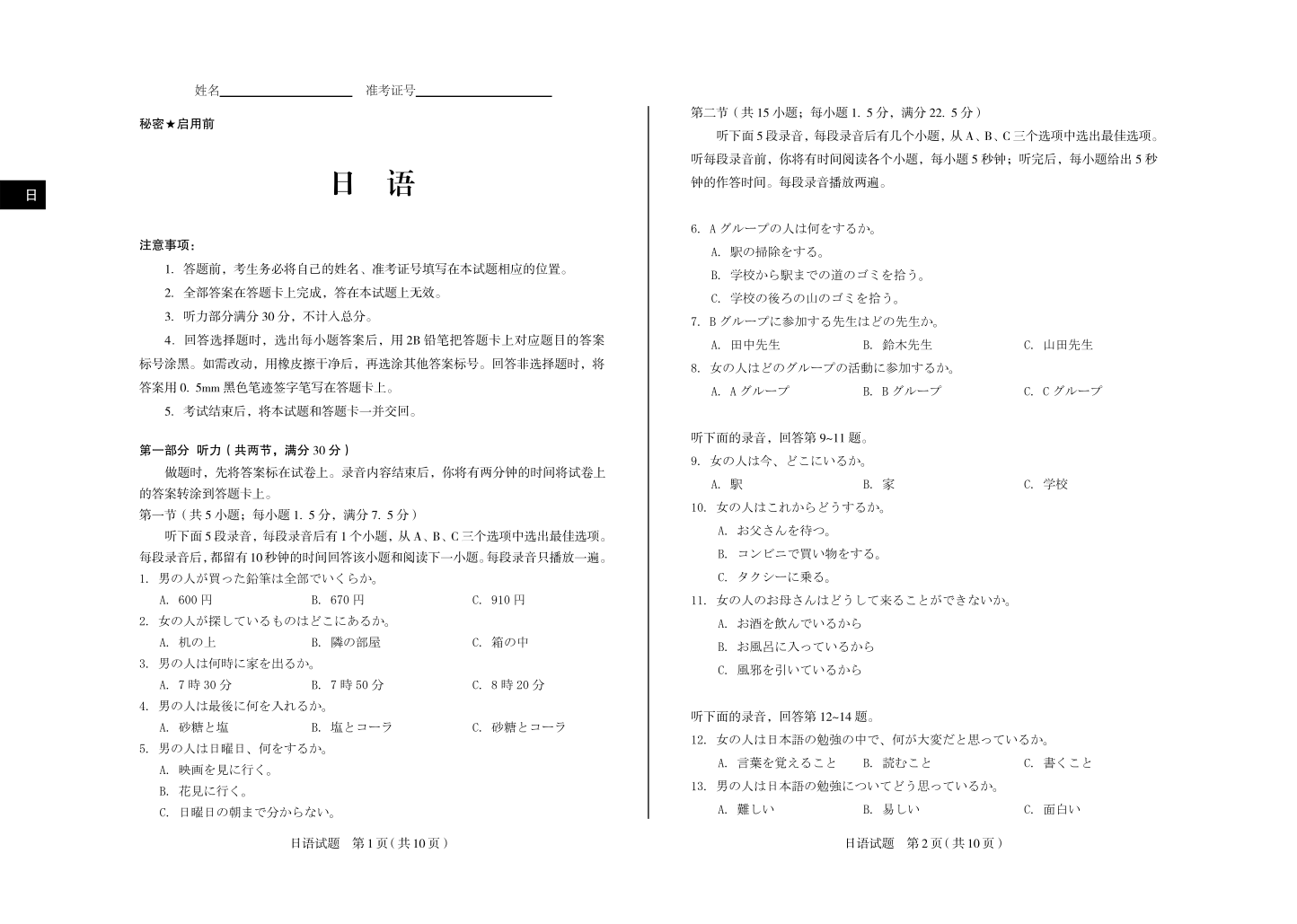 山西省区域高中2025届高三考前三模测试日语