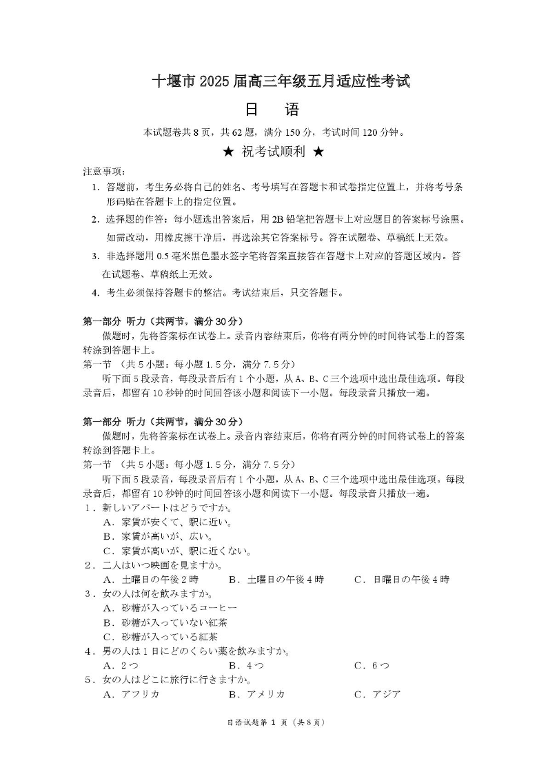 湖北省十堰市2025届下学期五月高三适应性考试日语