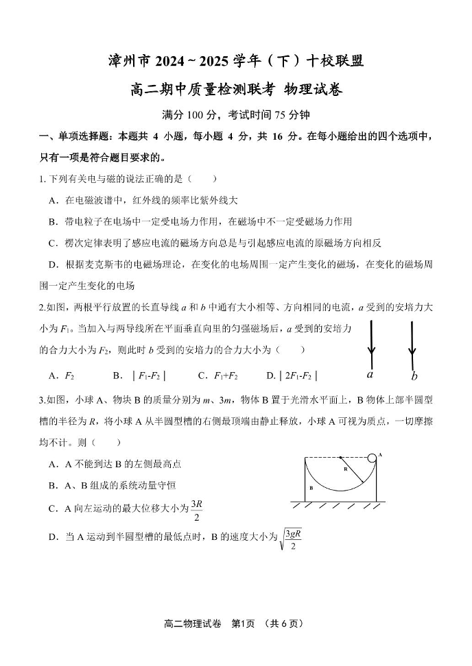 福建省漳州市十校联盟2024-2025学年下学期高二期中考试物理+答案