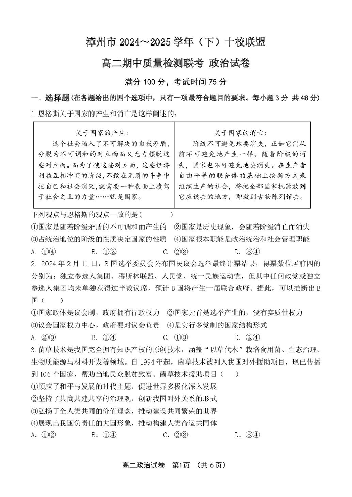 福建省漳州市十校联盟2024-2025学年下学期高二期中考试政治+答案