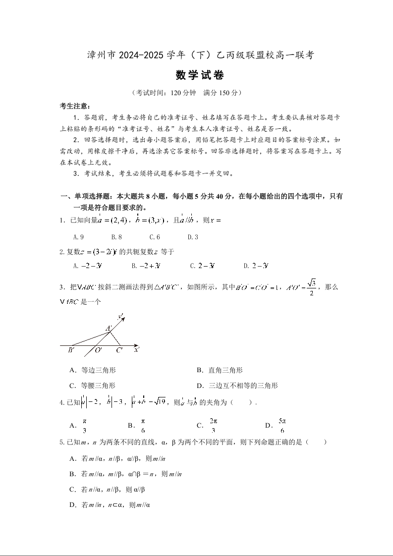 福建省漳州市乙丙级联盟校2024-2025学年下学期高一期中考试数学+答案