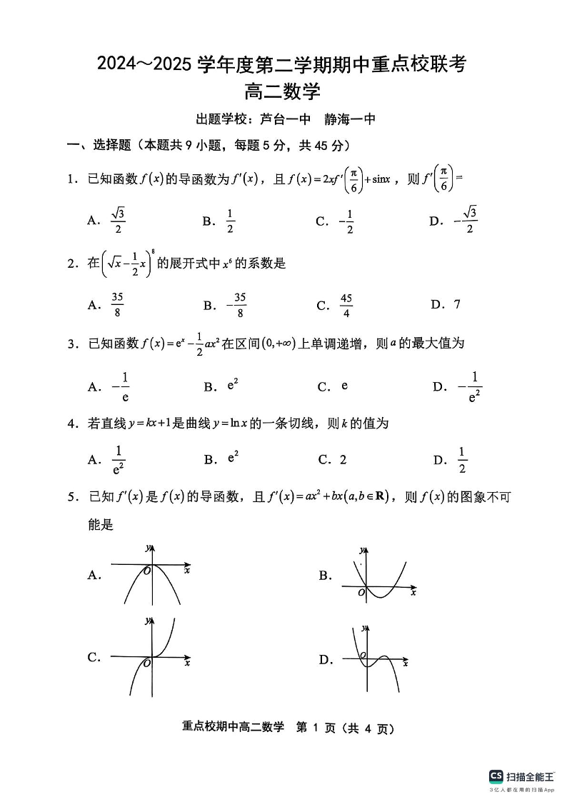 天津市五区县重点校联考2024-2025学年下学期4月高二期中考试数学