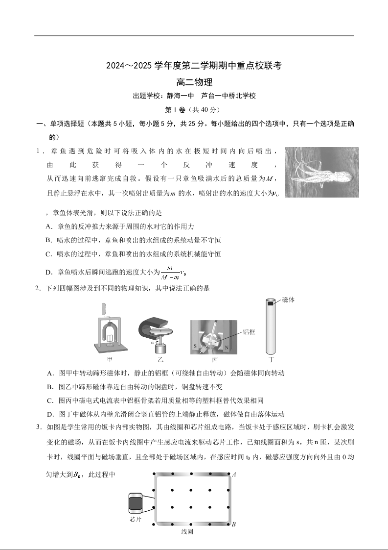 天津市五区县重点校联考2024-2025学年下学期4月高二期中考试物理+答案
