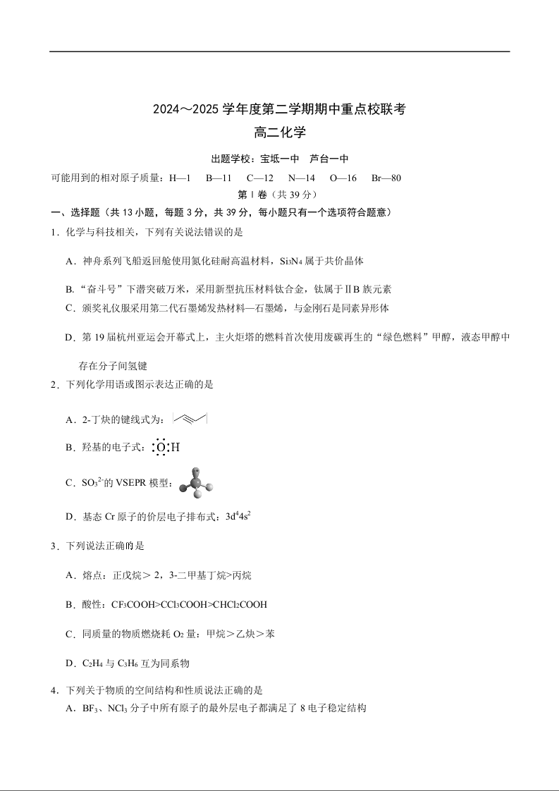 天津市五区县重点校联考2024-2025学年下学期4月高二期中考试化学+答案