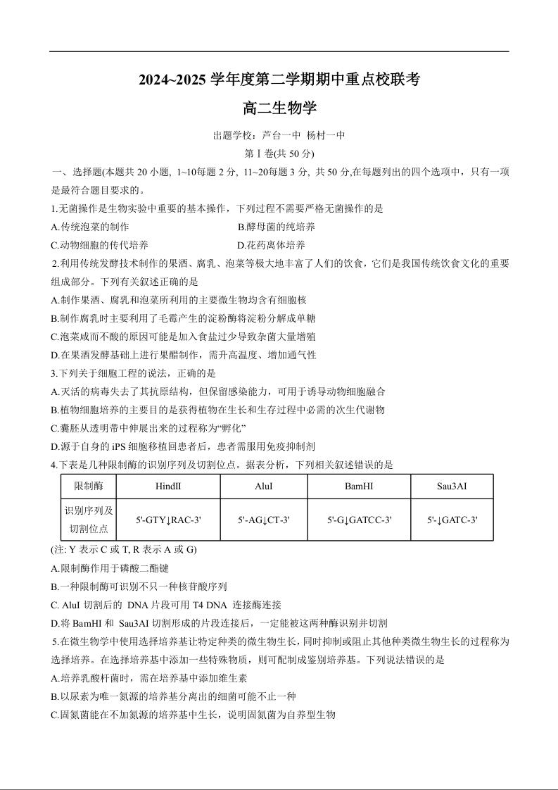 天津市五区县重点校联考2024-2025学年下学期4月高二期中考试生物