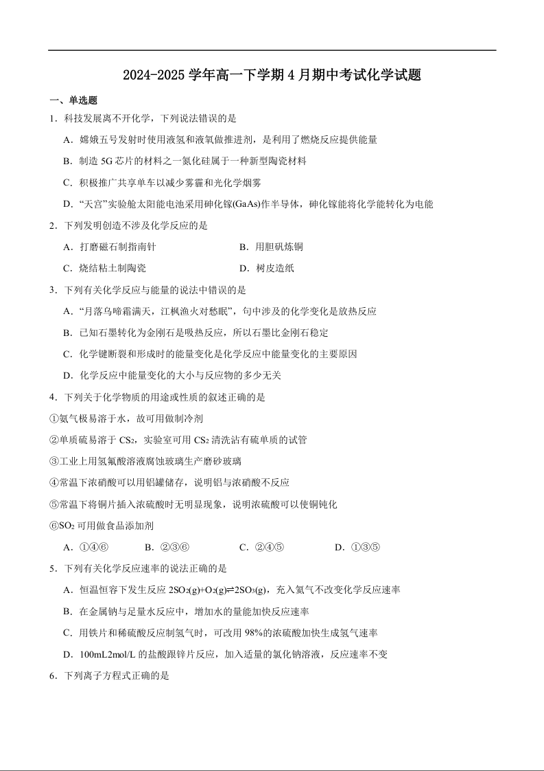 天津市五区县重点校联考2024-2025学年下学期4月高一期中考试化学+答案