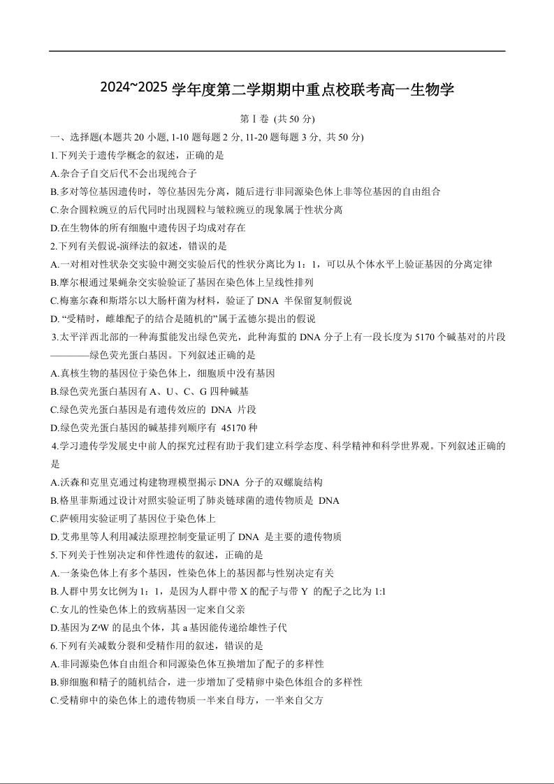 天津市五区县重点校联考2024-2025学年下学期4月高一期中考试生物