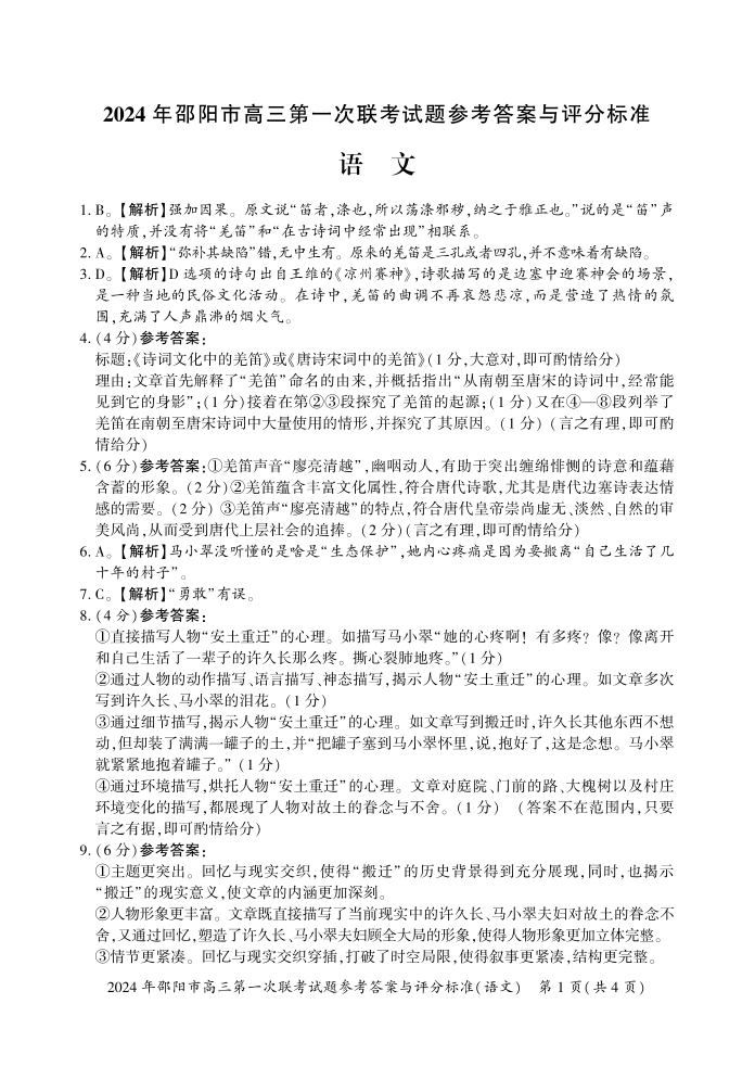 湖南省邵阳市2024届高三第一次联考(邵阳一模)语文答案